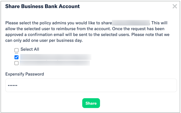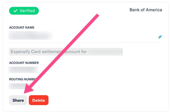 (Redmond clients only) Once that bank account is confirmed and allows it, click the Share button and check the box next to yourcompanyname@redmondaccounting.com to share your bank account with us so that we can reimburse your staff on the reimbursable expense reports that you approve.