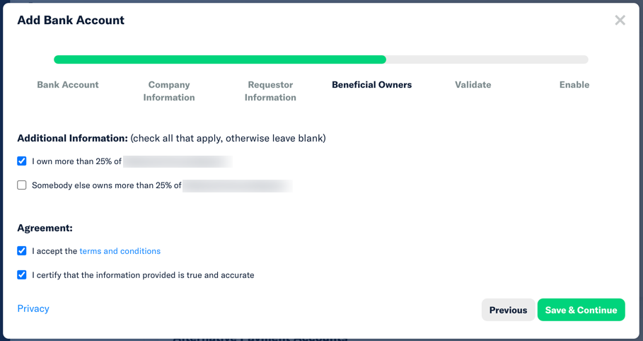 Check the box to confirm that you or someone else owns more than 25% of the company. Then check the boxes to accept the terms and certify the information provided, then click Save & Continue.